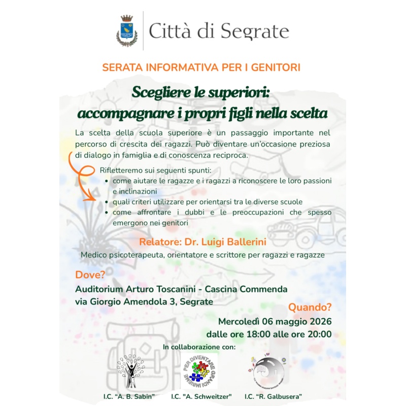 Mercoledì 6 maggio dalle 18 alle 20 a Cascina Commenda - Via Amendola, si terrà l'incontro Scegliere le superiori: accompagnare i propri figli nella scelta con il Dottor Luigi Ballerini. La serata è organizzata insieme agli Istituti Comprensivi del territorio: Schweitzer, Sabin, Galbusera.