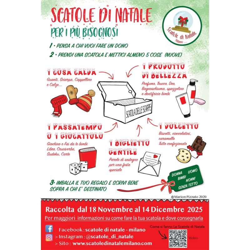 Per quanto riguarda Milano 2, l’Associazione Genitori raccoglie le scatole dal primo al 5 dicembre alla materna e alle medie: (all’infanzia dalle 8 alle 9 e dalle 15:45 alle 16 sul tavolo in esterno, inserendole in scatoloni, alle medie lasciandole ai commessi in atrio).