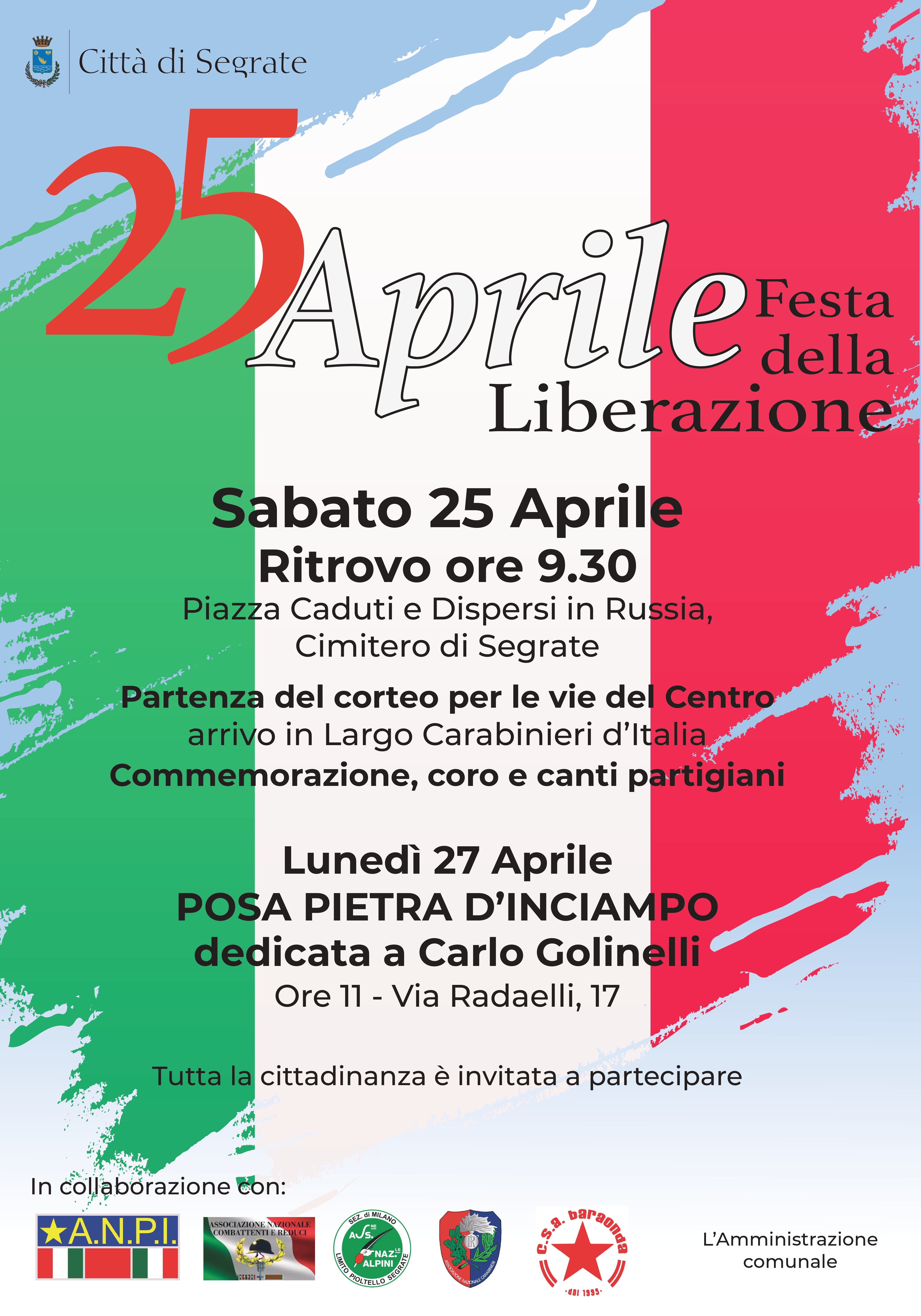 Il 25 Aprile il Comune celebra l'anniversario della Liberazione dal nazifascismo. Sono due gli appuntamenti in programma, sabato 25 aprile il tradizionale corteo con l'arrivo in Largo Carabinieri d'Italia e lunedì 27 aprile la posa della prima pietra di inciampo cittadina dedicata alla memoria del segratese Carlo Golinelli.