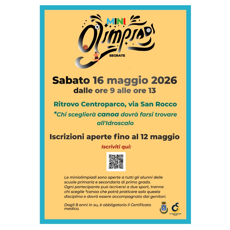 Le iscrizioni sono aperte fino al 12 maggio. Possono partecipare alle Miniolimpiadi i bambini della scuola primaria e i ragazzi della scuola secondaria di primo grado. Dagli 8 anni in su è obbligatorio il certificato medico per attività sportiva non agonistica che andrà caricato sul form di iscrizione disponibile al link https://shorturl.at/ZPHuL o inquadrando il QR Code pubblicato sulla locandina dell'evento.