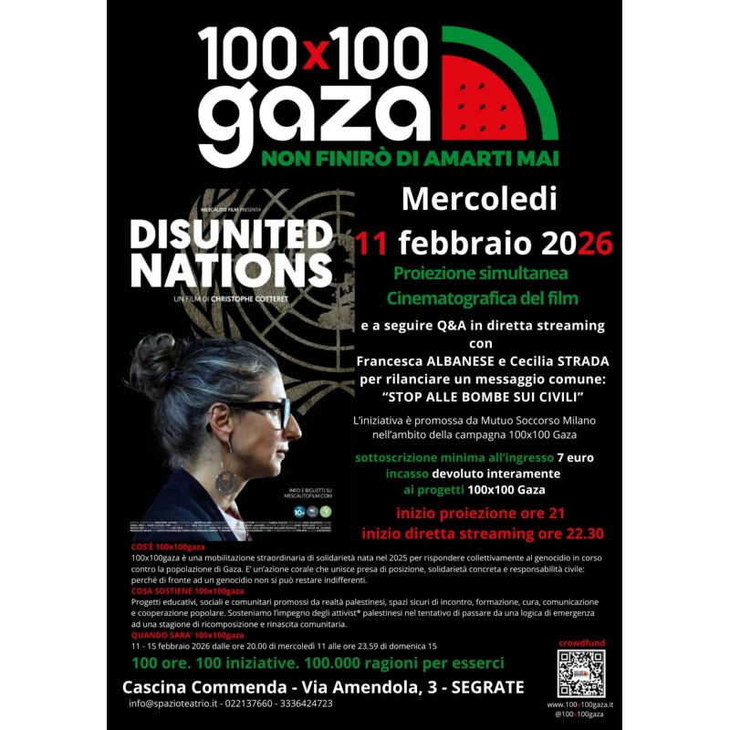 100x100gaza è una mobilitazione straordinaria di solidarietà nata nel 2025 per rispondere collettivamente alla catastrofe provocata dal genocidio inflitto da Israele sulla popolazione di Gaza. E' un'azione corale che unisce presa di posizione, solidarietà concreta e responsabilità civile, perchè di fronte a distruzione e sofferenza non si può restare indifferenti.