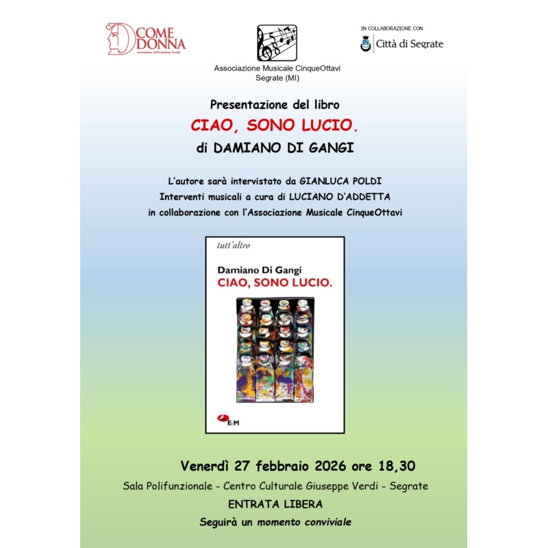 Venerdì 27 febbraio alle al Centro Verdi – Via XXV Aprile Segrate MI, Damiano di Gangi presenta il suo libro "Ciao, sono Lucio", Edizioni della Meridiana.