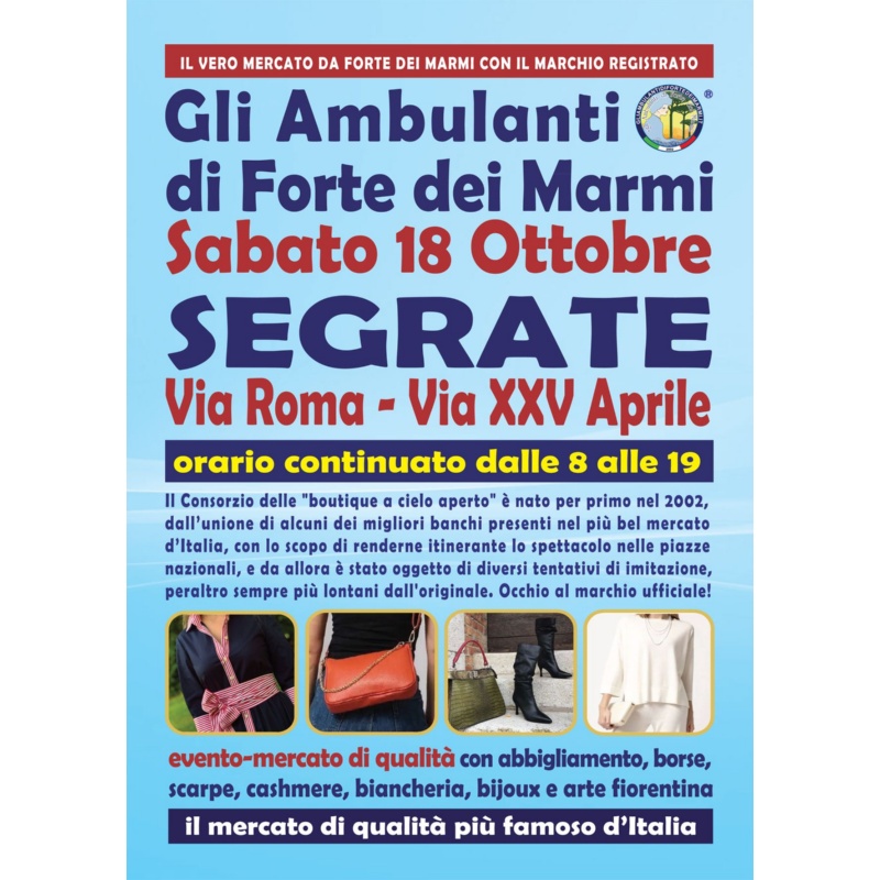 Tempo d’autunno e torna a Segrate sabato 18 ottobre, dalle 8 alle 19 in via Roma e via 25 Aprile il mercato di qualità più famoso d’Italia, l’originale Consorzio de Gli Ambulanti di Forte dei Marmi®, con le sue originali e ormai mitiche boutique a cielo aperto®.
