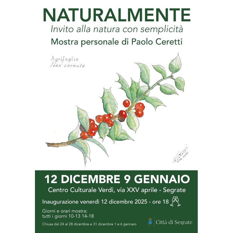 Dal 12 dicembre al 9 gennaio il Centro Verdi - Via XXV Aprile, Segrate MI ospita la mostra “Naturalmente – Invito alla natura con semplicità”, personale di Paolo Ceretti.