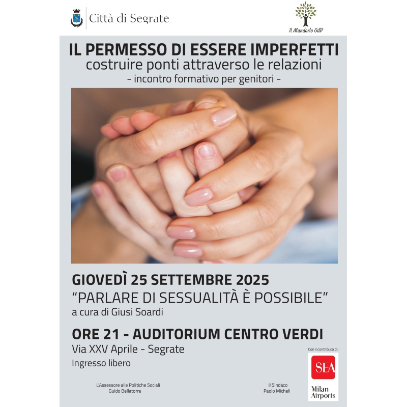 Giovedì 25 settembre alle 21 al Centro Verdi – Via XXV Aprile il Comune e l’associazione Il Mandorlo, con il contributo di SEA Milan Airports, organizzano l’incontro “Parlare di sessualità è possibile”, a cura di Giusi Soardi. L’iniziativa rientra del ciclo di appuntamenti formativi per i genitori “Il permesso di essere imperfetti. Costruire ponti attraverso le relazioni”.