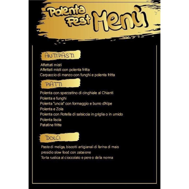 affettati misti con polenta fritta, carpaccio di manzo con funghi e polenta fritta, polenta con spezzatino di cinghiale al Chianti, polenta e funghi, polenta "uncia" con formaggio e burro d'Alpe, polenta e zola, polenta con rotella di salsiccia in griglia o in umido e per i più light polenta liscia.