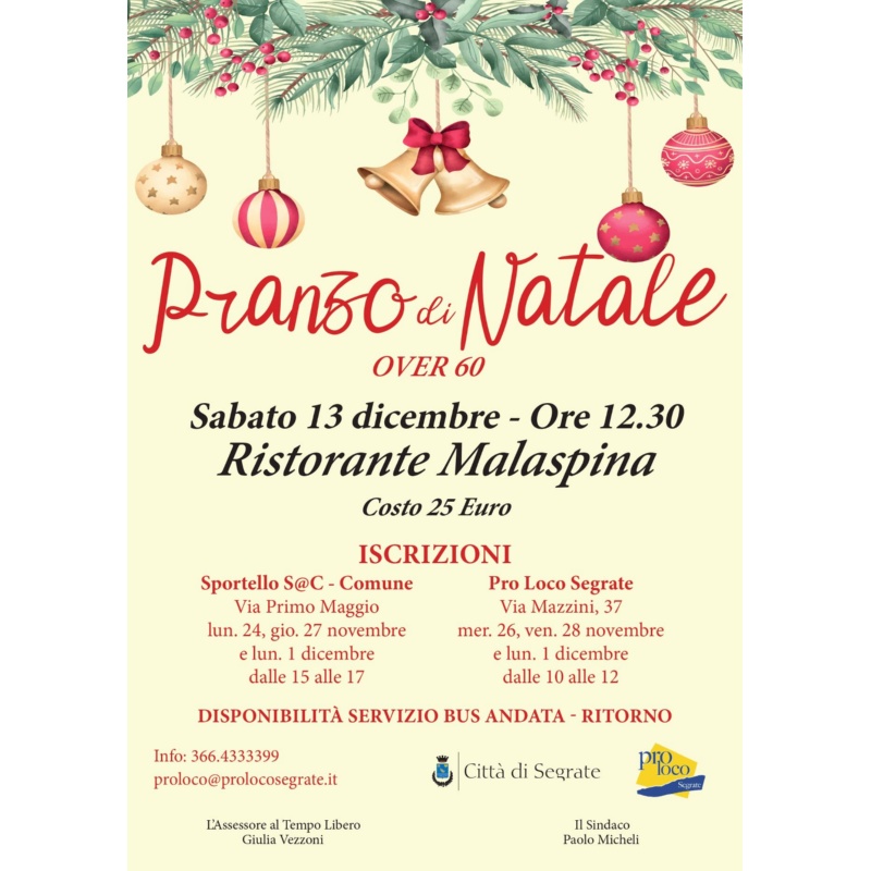 Sabato 13 dicembre dalle ore 12.30 al Ristorante Malaspina, appuntamento con il Pranzo di Natale per gli over 60 segratesi, organizzato con la Proloco Segrate.