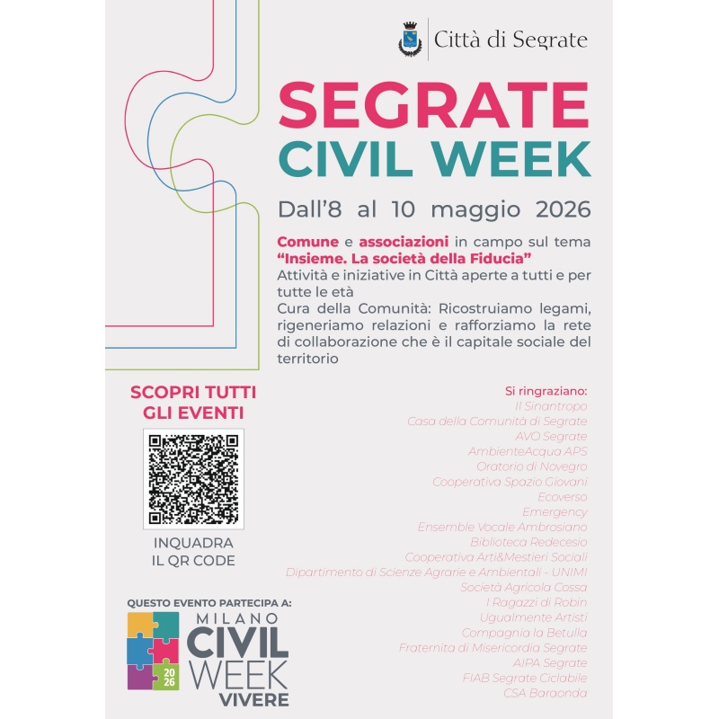 Anche quest'anno il Comune è partner di Milano Civil Week e partecipa alla manifestazione con la "Segrate Civil Week". L’edizione 2026 si concentra sul tema“INSIEME. La società della fiducia”.