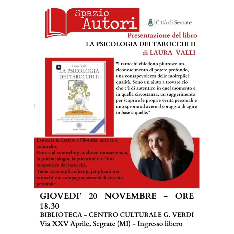 All’interno della rassegna “Spazio Autori”, giovedì 20 novembre alle 18.30 in Biblioteca – Via 25 Aprile, Laura Valli presenta “La psicologia dei Tarocchi II” - Dove i numeri diventano ritmi della psiche, svelando schemi che riflettono la percezione del mondo.