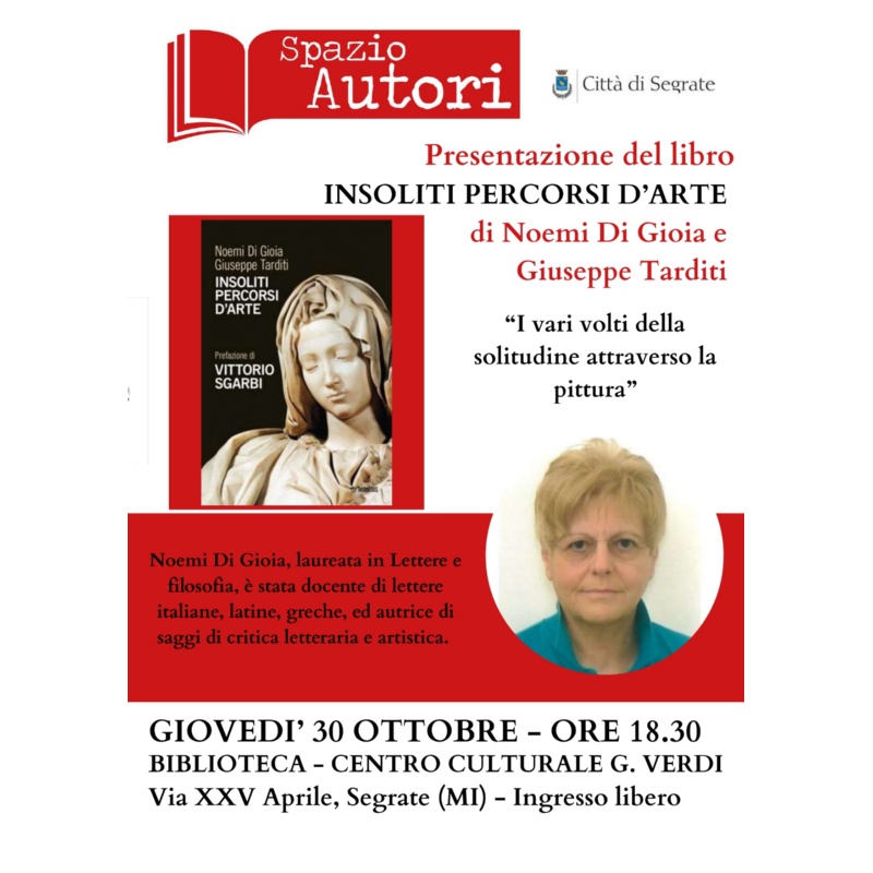 All'interno della rassegna "Spazio Autori", giovedì 30 ottobre alle 19.30 in Biblioteca - Via 25 Aprile Segrate MI, Noemi Di Gioia presenta il saggio "Insoliti percorsi d'arte", "I vari volti della solitudine attraverso la pittura", scritto con Giuseppe Tarditi e con la prefazione di Vittorio Sgarbi.