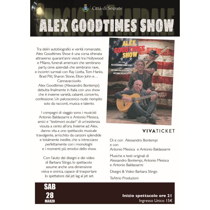 Alex Goodtimes (Alessandro Bontempi) debutta finalmente in Italia con uno show che è insieme varietà, cabaret, concerto, confessione. Un palcoscenico nudo riempito solo da racconti, musica e talento.