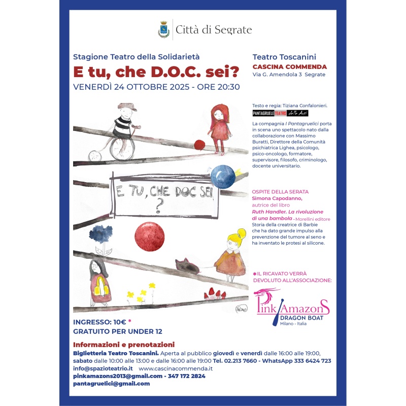 All’interno della Stagione del Teatro della Solidarietà, venerdì 24 ottobre alle 20.30 al Teatro Toscanini Cascina Commenda - Via G. Amendola 3 Segrate, la compagnia I Pantagruelici porta in scena lo spettacolo “E tu, che D.O.C. sei?” L’iniziativa è organizzata dall’associazione Pink Amazons Dragon Boat.