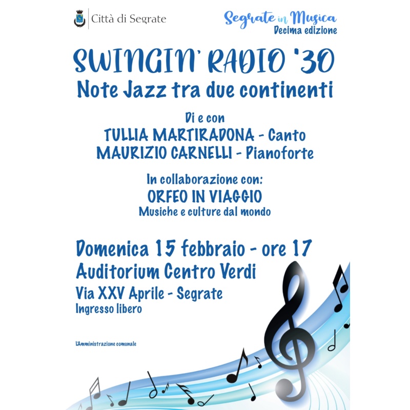 Domenica 15 febbraio alle 17 al Centro Verdi, per la rassegna Segrate in Musica, in collaborazione con Orfeo in Viaggio - Incontri tra musica e parole e Musiche e culture del mondo Terza edizione, si terrà il concerto “Swingin’ Radio. Note Jazz tra due continenti”.