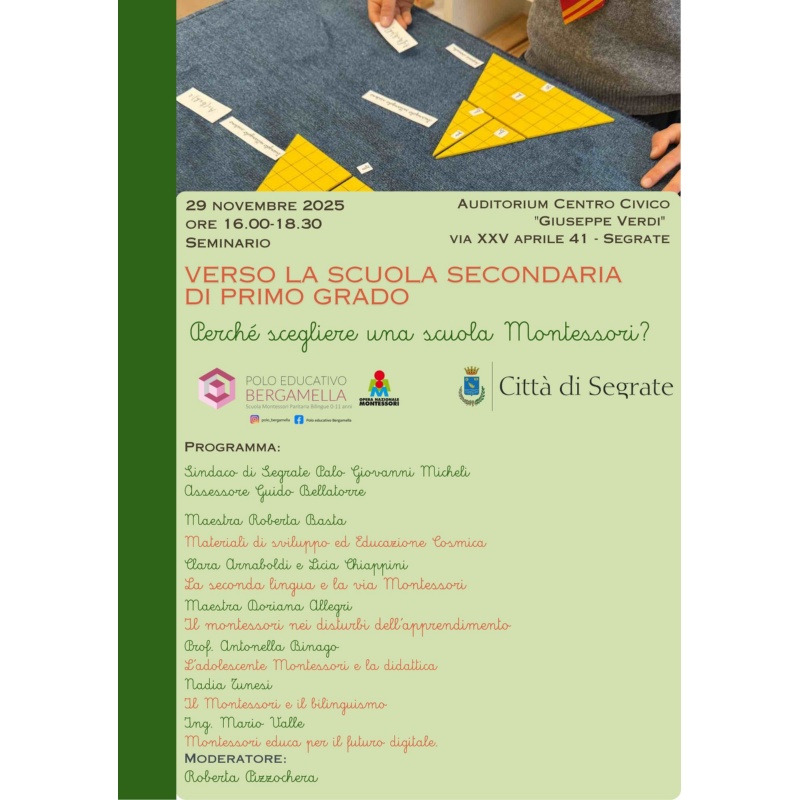 Il 29 novembre dalle 16 alle 18.30 nell’Auditorium del Centro Verdi - Via XXV Aprile 41, Segrate, si terrà il seminario dedicato a genitori e insegnanti “Verso la Scuola Secondaria di Primo Grado. Perché scegliere una scuola Montessori?”, organizzato dal Polo educativo Bergamella che in concessione la scuola Milano 2 sud.