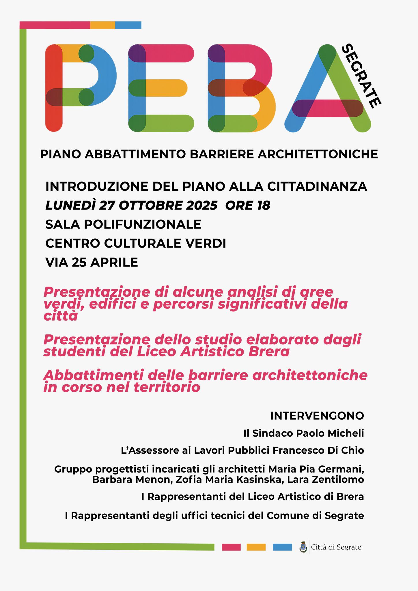Lunedì 27 ottobre, alle ore 18, presso la sala polifunzionale del Centro Verdi di via 25 Aprile, si terrà il primo dei due incontri pubblici di presentazione alla cittadinanza del Piano per l’Eliminazione delle Barriere Architettoniche (PEBA).