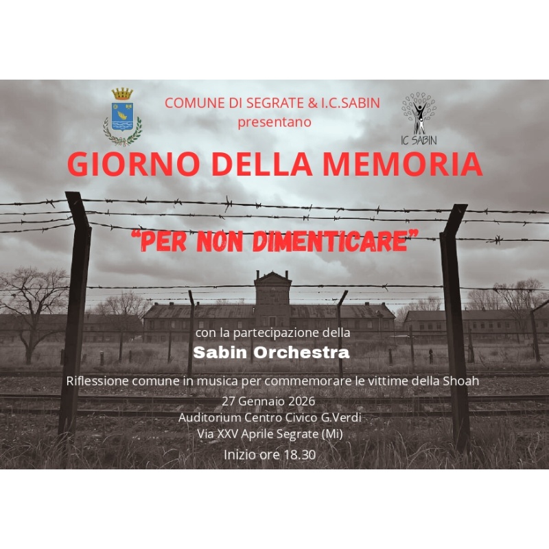 Per il Giorno della Memoria, si rinnova la collaborazione tra il Comune e l’Istituto Comprensivo Sabin, che martedì 27 gennaio alle 18.30 al Centro Verdi - Via XXV Aprile, Segrate MI, presentano “Per non dimenticare”. Riflessione comune in musica per commemorare le vittime della Shoah, con la partecipazione della Sabin Orchestra.