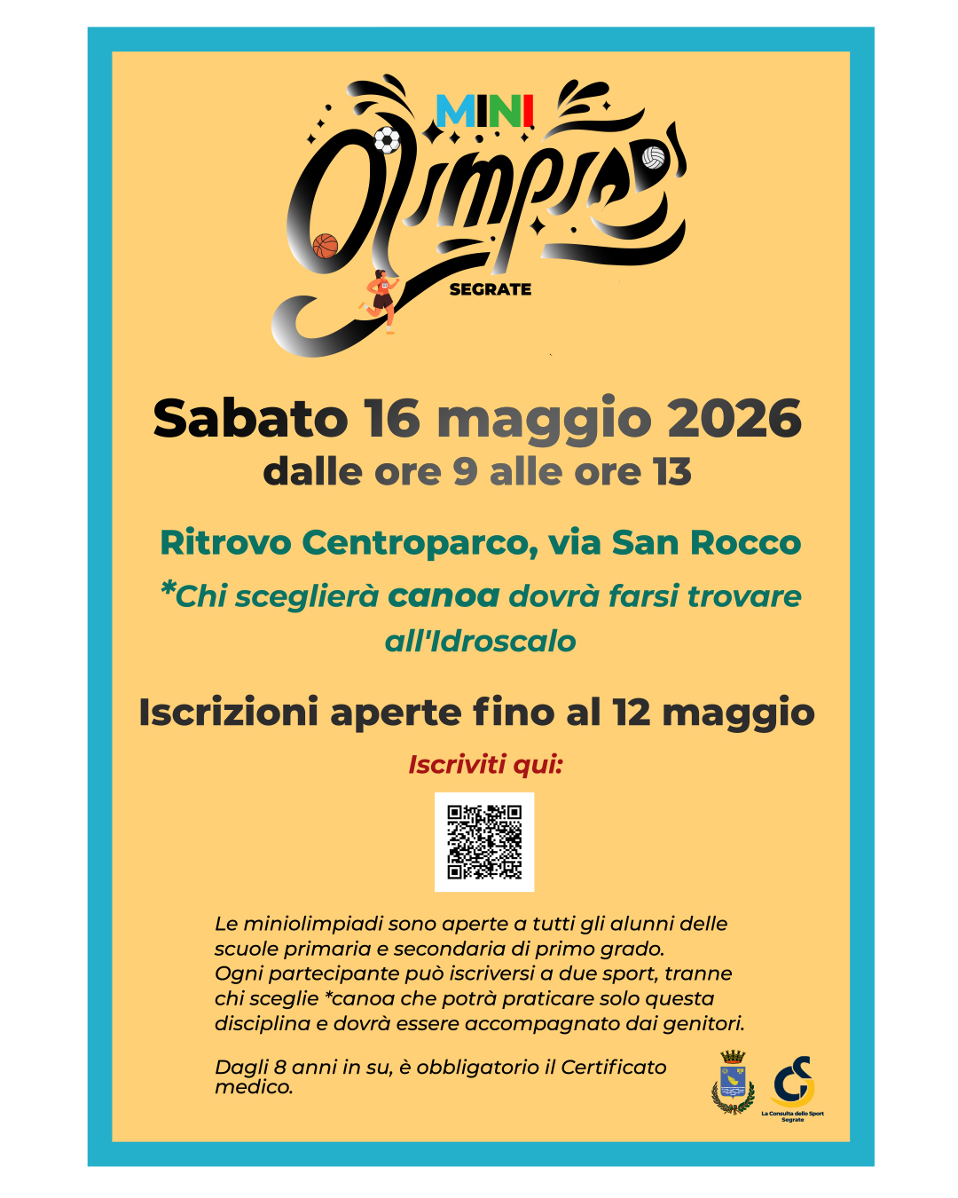 Le iscrizioni sono aperte fino al 12 maggio. Possono partecipare alle Miniolimpiadi i bambini della scuola primaria e i ragazzi della scuola secondaria di primo grado. Dagli 8 anni in su è obbligatorio il certificato medico per attività sportiva non agonistica che andrà caricato sul form di iscrizione disponibile al link https://shorturl.at/ZPHuL o inquadrando il QR Code pubblicato sulla locandina dell'evento.