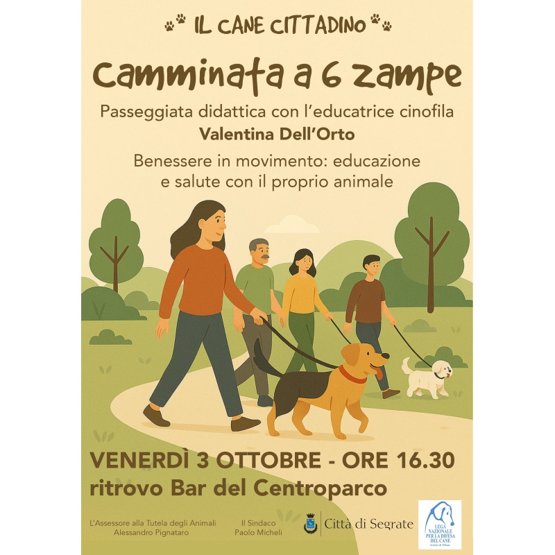 Nell’ambito del progetto “Il Cane Cittadino”, per la cura e la tutela degli amici a quattro zampe, venerdì 3 ottobre il Comune e la Lega Nazionale per la Difesa del Cane Sezione di Milano, organizzano la “Camminata a 6 zampe”. Una passeggiata didattica con l’educatrice cinofila Valentina Dell’Orto