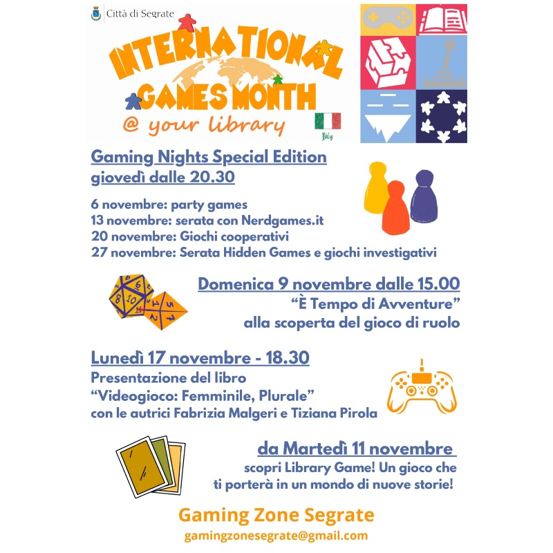 Ormai il gioco ha contagiato le biblioteche di tutto il mondo e anche per il 2025 torna l’occasione per aderire all’International Games Month @your library ITALY: durante tutto il mese di novembre anche la Biblioteca Civica ha deciso di mostrare e raccontare al pubblico il ruolo che il gioco ha all’interno della comunità e dei servizi bibliotecari. In questo contesto, tanti appuntamenti attendono appassionati e curiosi nella Gaming Zone - Via 25 Aprile, Segrate MI.