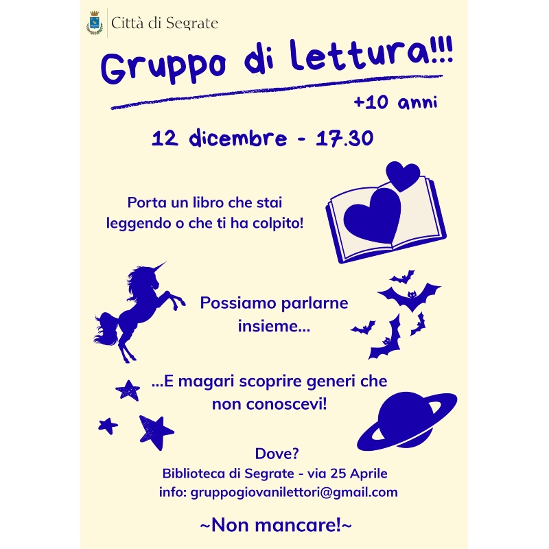 Venerdì 12 dicembre alle 17.30 in Biblioteca - Via XXV Aprile, porta un libro che stai leggendo o che ti ha colpito: potremo parlarne insieme e magari scoprire generi che non conoscevi!