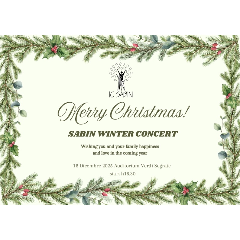 Giovedì 18 dicembre alle 18.30 al Centro Verdi - Via 25 Aprile - Segrate MI, si terrà il "Merry Christmas! Sabin Winter Concert" Wishing you and your family happiness and love in the coming year, concerto di Natale degli allievi e dei docenti della sezione musicale della scuola media Sabin di Milano 2.