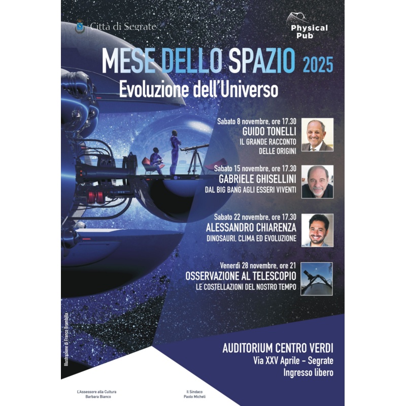 Il tema chiave di quest'anno sarà “Evoluzione dell’Universo”, che verrà affrontato dai tre relatori internazionali ospiti al Centro Verdi - Via XXV Aprile, Segrate MI. Per riflettere su questi argomenti, la rassegna si concluderà con una pubblica osservazione del cielo al telescopio.