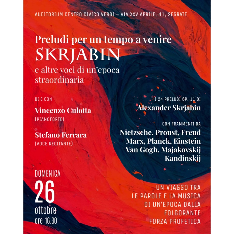 Domenica 26 ottobre alle 16.30 al Centro Verdi – Via 25 Aprile, si terrà lo spettacolo “Preludi per un tempo a venire” – Skrjabin e altre voci di un’epoca straordinaria. Di e con Vincenzo Culotta al pianoforte e Stefano Ferrara, voce recitante, un viaggio in forma di concerto, che porterà all’alba di un nuovo secolo, tra le parole e la musica di un’epoca dalla folgorante forza profetica.