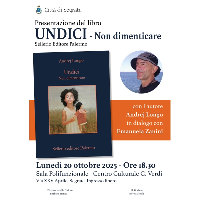 All’interno della rassegna “Incontro con l’Autore”, lunedì 20 ottobre alle 18.30 nella Sala Polifunzionale del Centro Verdi - Via XXV Aprile, Segrate, Andrej Longo presenta il suo libro “Undici. Non dimenticare”, Sellerio Editore Palermo.