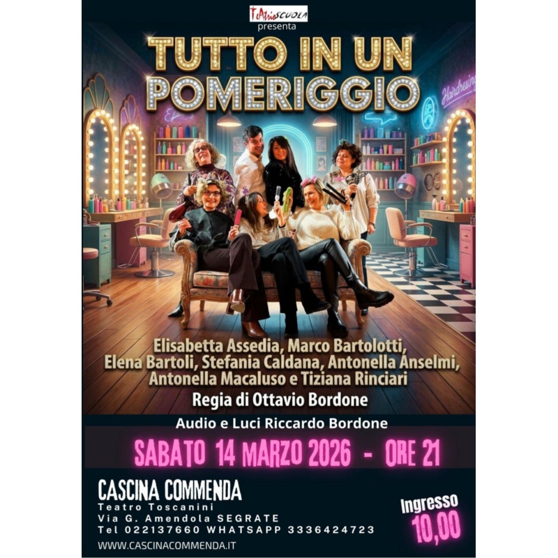 Sabato 14 marzo alle ore 21 sul palco di Cascina Commenda - Via Amendola 3, la scuola di TeAtrio presenta lo spettacolo "Tutto in un pomeriggio", di Ottavio Bordone, con Elisabetta Assedia, Marco Bartolotti, Elena Bartoli, Stefania Caldana, Antonella Macaluso, Antonella Anselmi, Tiziana Rinciari.